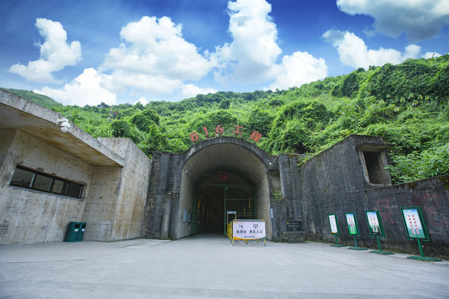 重慶816工程遺址,位于重慶市涪陵區(qū)白濤街道,緊鄰烏江,背靠武陵山。1966年由中央軍委、周恩來總理批準(zhǔn)建設(shè),該工程打山洞用時(shí)8年,安裝設(shè)備用時(shí)9年,總投資7.46億元人民幣。先后投入6萬多人參與建設(shè),工程歷經(jīng)急建、緩建、停建和轉(zhuǎn)產(chǎn)4個(gè)階段,1984年因國家戰(zhàn)略調(diào)整,工程停建。2002年國防科工委同意對(duì)816工程解密。816工程遺址軸向疊加全長(zhǎng)20余千米,完全隱藏在山體內(nèi)部,洞內(nèi)冬暖夏涼,四季恒溫?偨ㄖ娣e10.4萬平方米,主洞室高達(dá)79.6米,拱頂跨高31.2米,洞內(nèi)有大型洞室18個(gè),道路、導(dǎo)洞、支洞、隧道及豎井130多條,建筑布局宛如迷宮,洞中有洞,洞中有樓,樓中有洞。