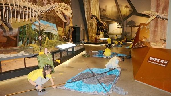 夜宿活動參與者在浙江自然博物院恐龍館中搭建帳篷。 受訪者供圖