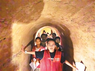 小小講解員在冉莊地道里參觀。