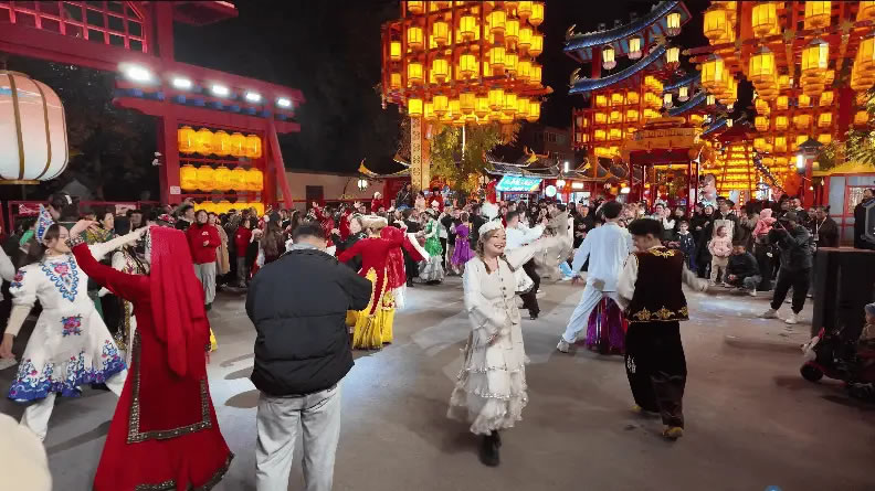 游客們?cè)谑⑹廊A疆·八卦城之夜街區(qū)載歌載舞,感受節(jié)日濃厚氛圍 (曾琳博 攝)