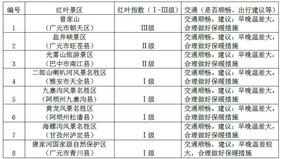 值得一提的是,近期較適宜觀賞紅葉的景點主要分布在四川省東北部曾家山、鹽井峽、光霧山景區(qū)。但今年受閏月和氣候等因素影響,預計紅葉觀賞期較往年推遲10~15天。
